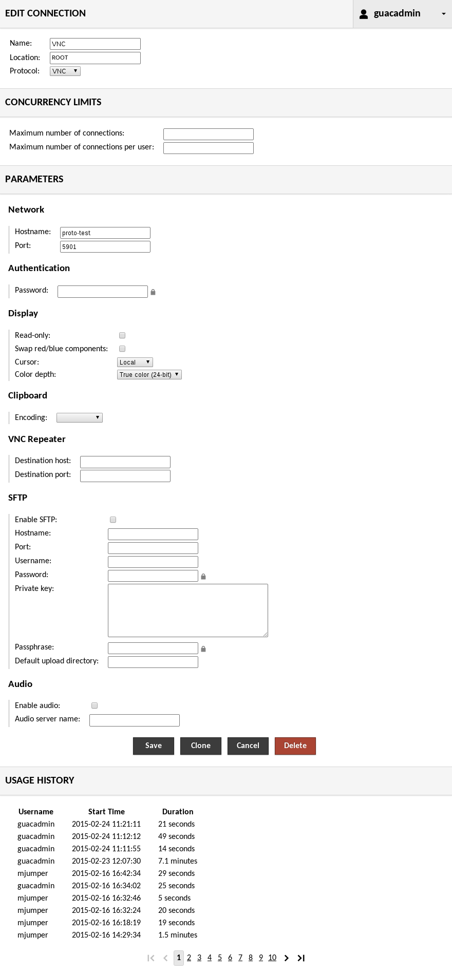 Initially, the connection history table will display only the most recent history records. You can page through these records to see how and when Guacamole has been used.