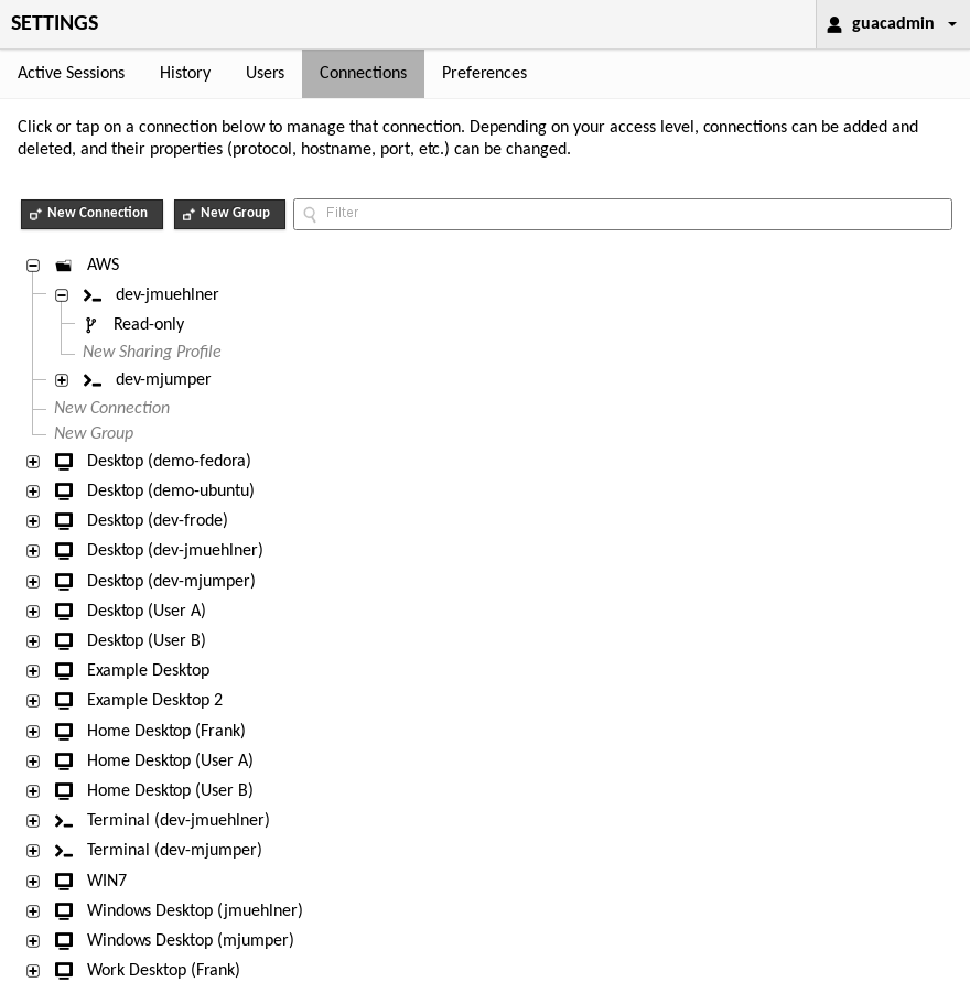 Clicking "Connections" within the list of settings sections will take you to the connection management screen. The connection management screen allows administrators to create and edit connections, sharing profiles, and connection groups. If you have a large number of connections, you can also enter search terms within the "Filter" field to filter the list of connections by name or protocol.