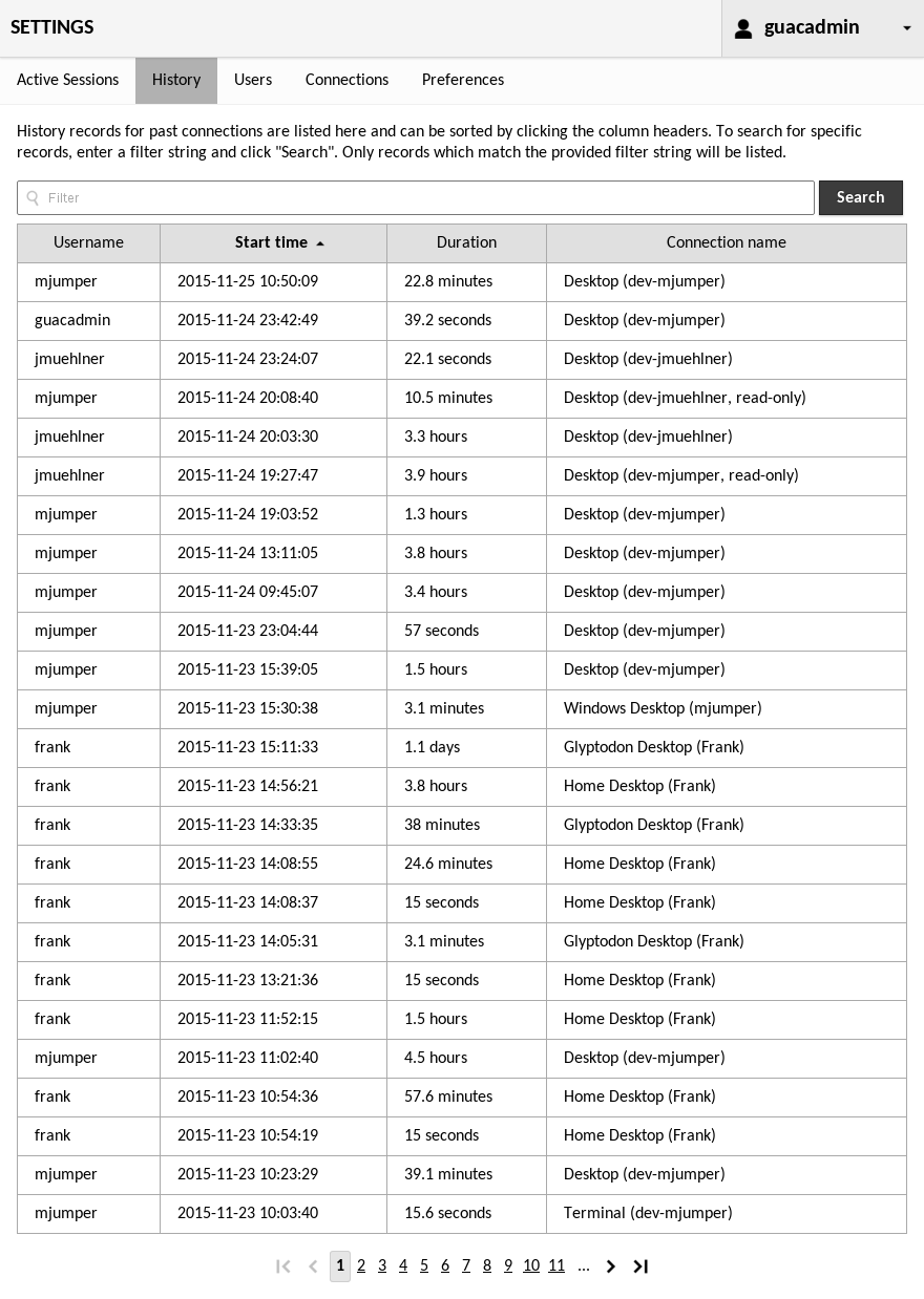 The content of the table can be limited through search terms specified in the "Filter" field. Entering search terms will limit the table to only sessions containing those terms. For example, to list only connections by the user "guacadmin" which have been active since March, 2015, you would enter: "guacadmin 2015-03". Beware that if a search term needs to contain spaces, it must be enclosed in double quotes to avoid being interpreted as multiple terms.