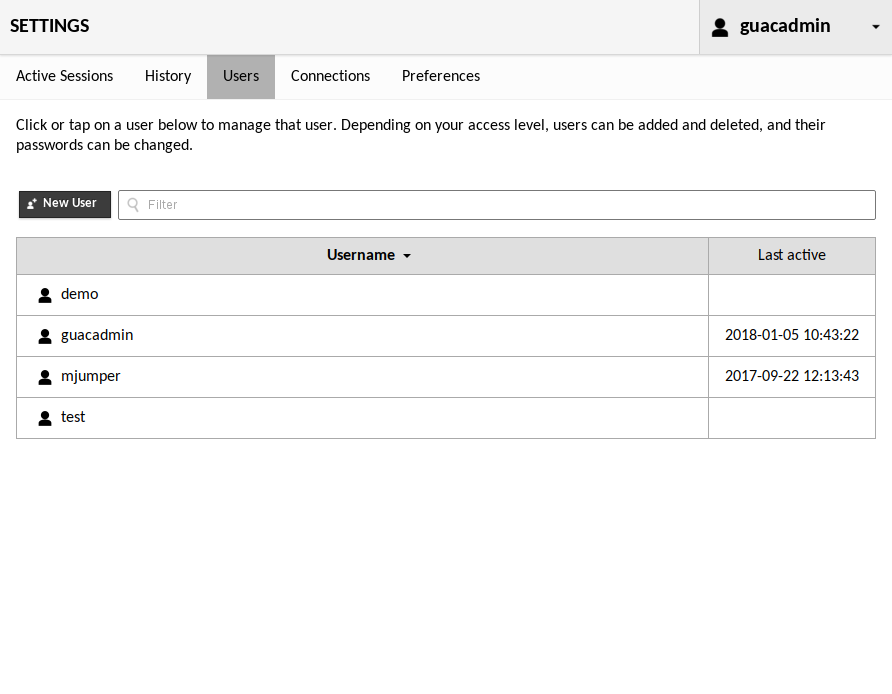 If you are using the default authentication mechanism, or another authentication extension, this chapter probably does not apply to you, and the management options will not be visible in the Guacamole interface. If, on the other hand, you are using one of the database authentication providers, and you are logged in as a user with sufficient privileges, you will see management sections listed within the settings screen: