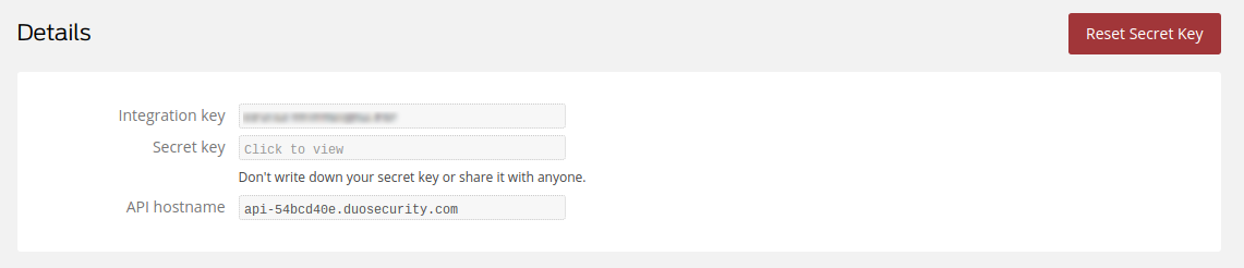 In addition to the above, you must also manually generate an "application key". The application key is required by Duo's authentication API, but is not provided by Duo. It is an arbitrary value meant to be unique to each deployment of an application using their API.
