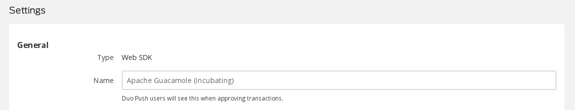 Within the settings of the newly-added application, rename the application to something more representative than "Web SDK". This application name is what will be presented to your users when they are prompted by Duo for additional authentication: